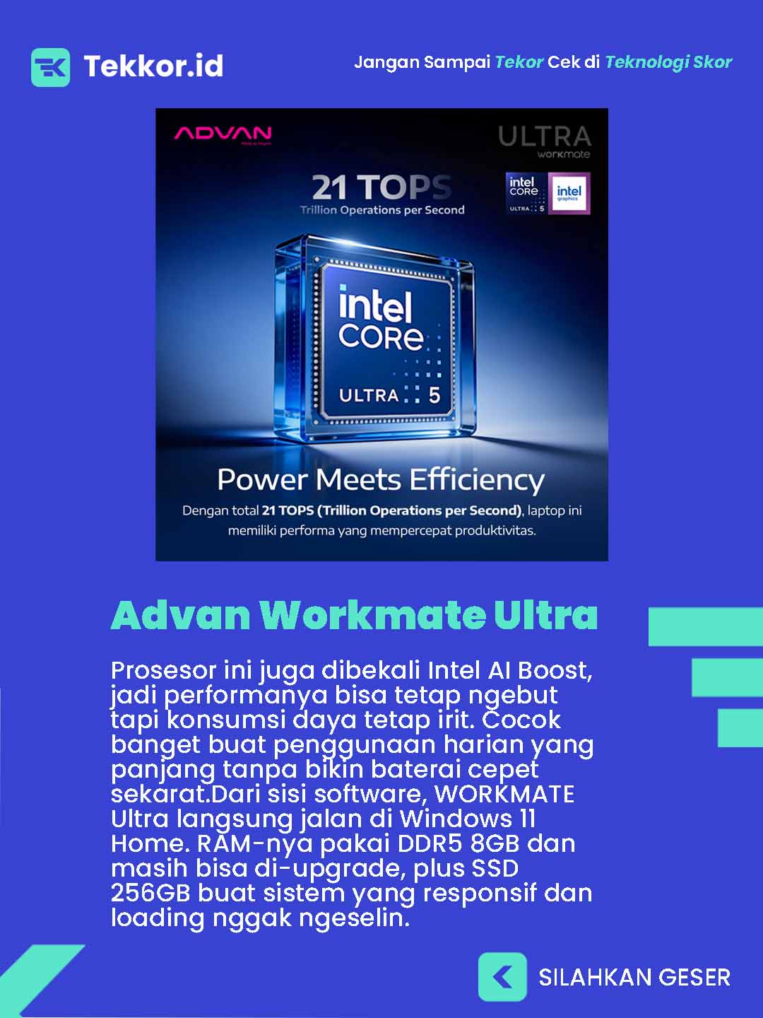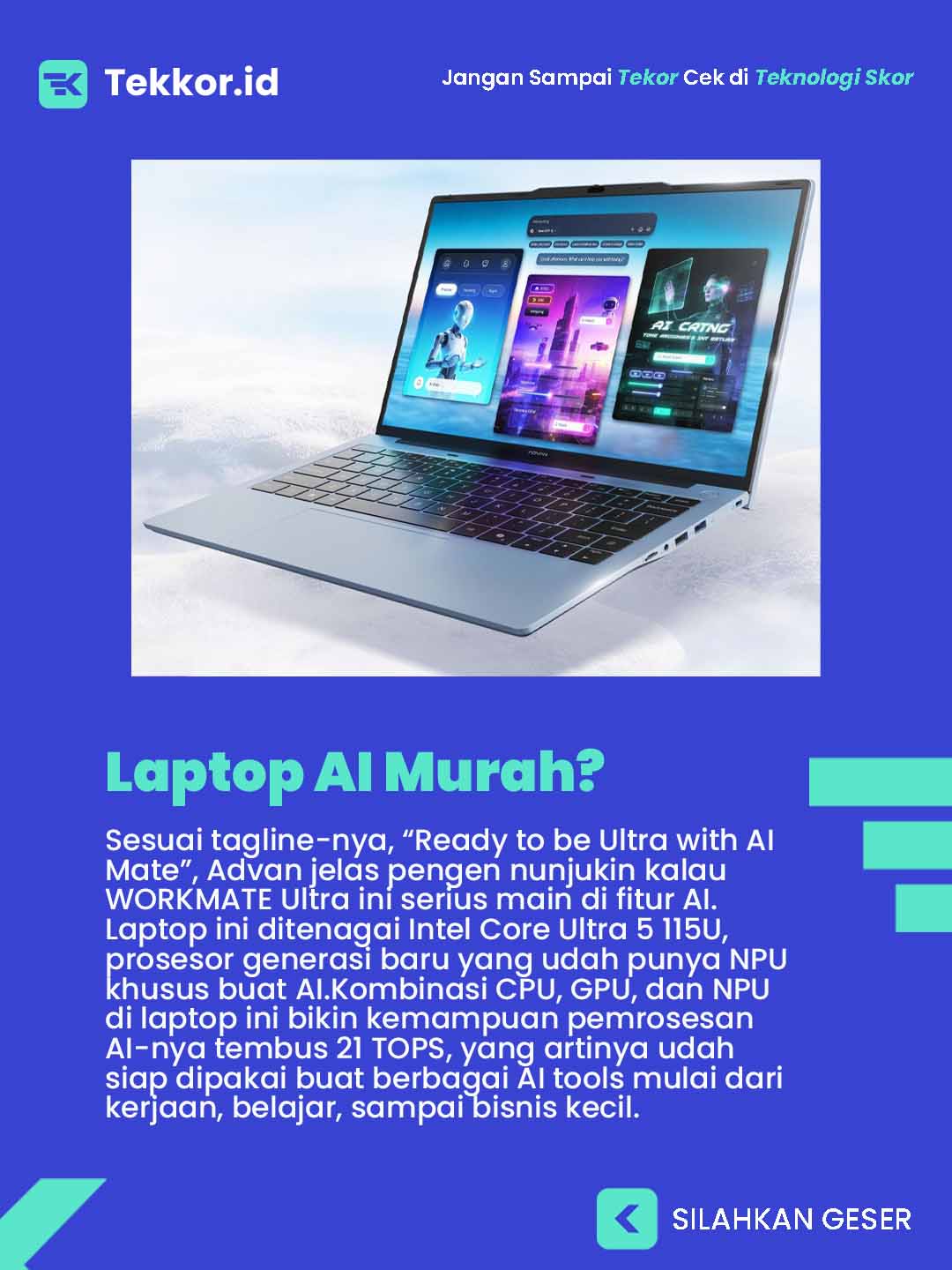 Sesuai tagline-nya, “Ready to be Ultra with AI Mate”, Advan jelas pengen nunjukin kalau WORKMATE Ultra ini serius main di fitur AI. Laptop ini ditenagai Intel Core Ultra 5 115U, prosesor generasi baru yang udah punya NPU khusus buat AI.