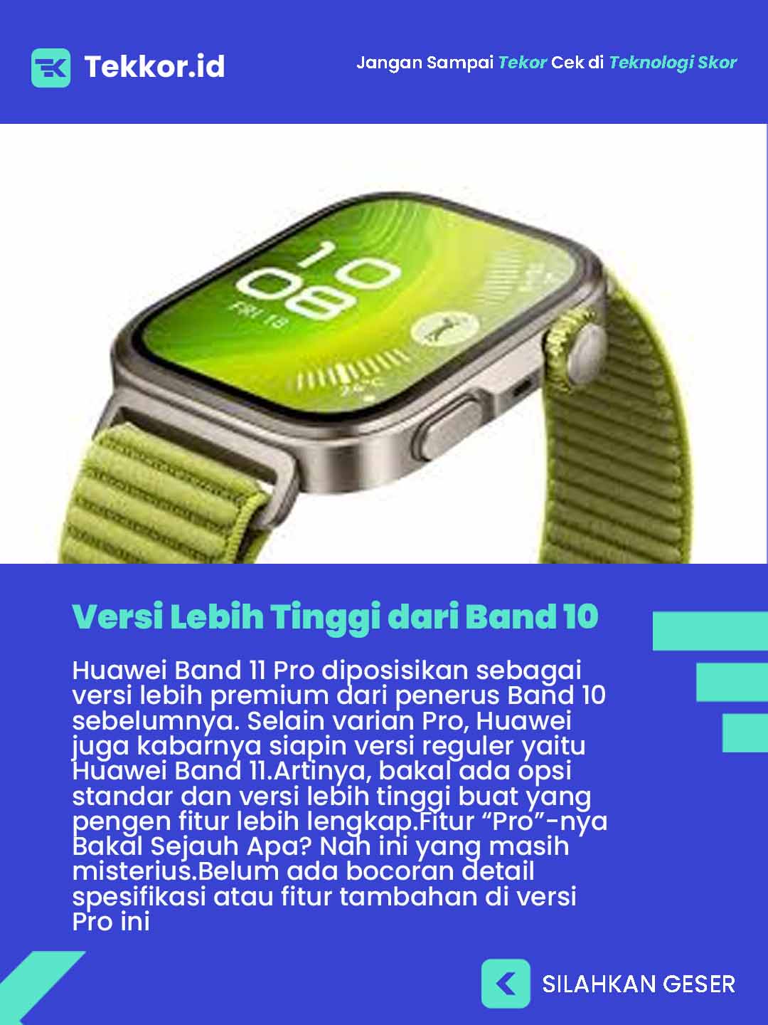 Huawei Band 11 Pro diposisikan sebagai versi lebih premium dari penerus Band 10 sebelumnya. Selain varian Pro, Huawei juga kabarnya siapin versi reguler yaitu Huawei Band 11.