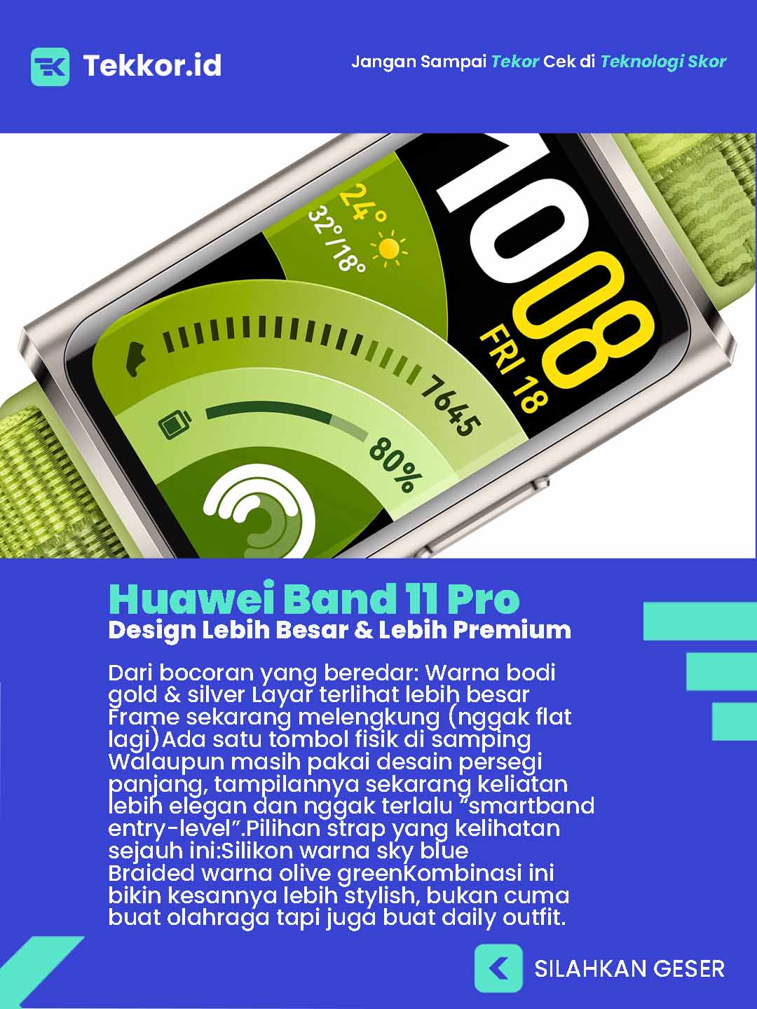 Walaupun masih pakai desain persegi panjang, tampilannya sekarang keliatan lebih elegan dan nggak terlalu “smartband entry-level”.