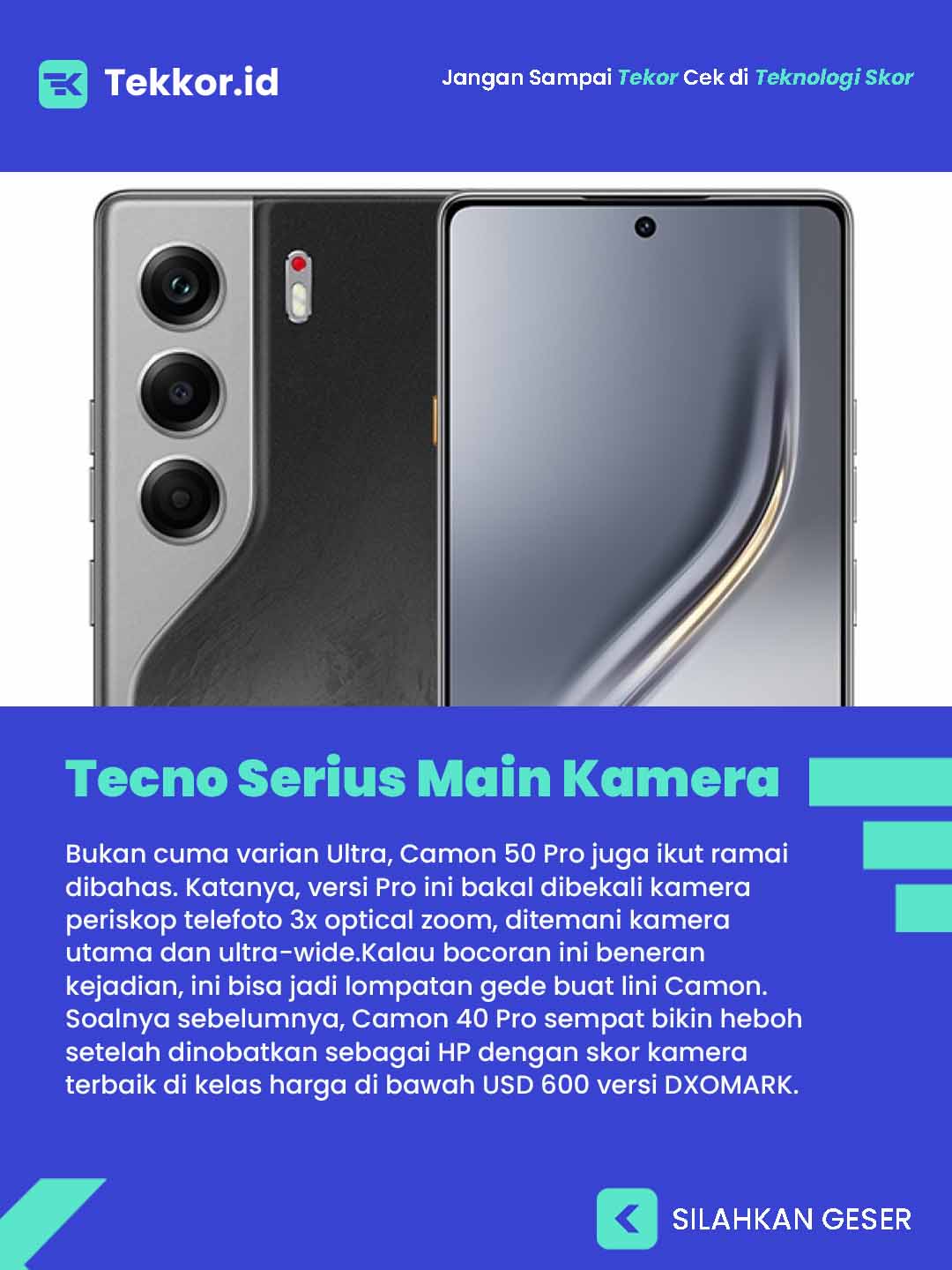 Bukan cuma varian Ultra, Camon 50 Pro juga ikut ramai dibahas. Katanya, versi Pro ini bakal dibekali kamera periskop telefoto 3x optical zoom, ditemani kamera utama dan ultra-wide.