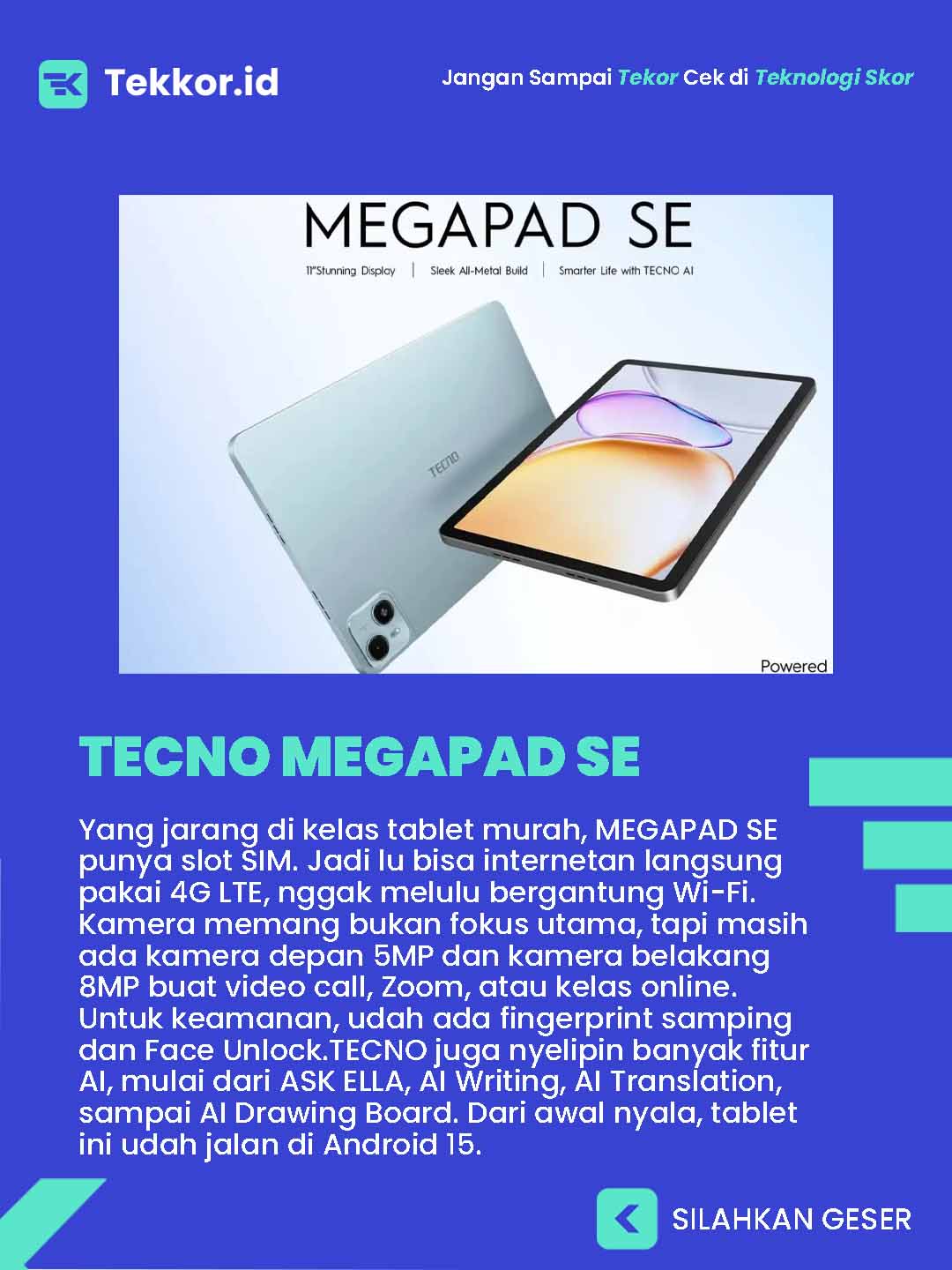 TECNO makin serius main di pasar tablet Indonesia. Setelah sebelumnya ngerilis MEGAPAD 11, sekarang mereka resmi ngelepas TECNO MEGAPAD SE—tablet harga 2 jutaan yang nyasar ke pelajar, keluarga, sampai user harian.