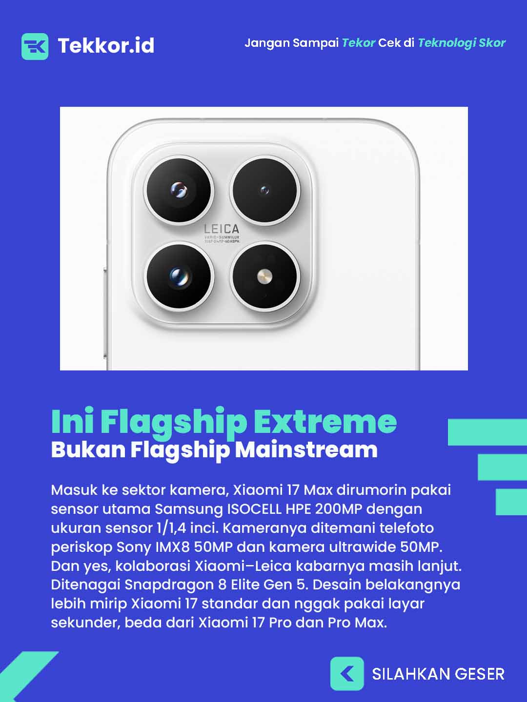 Sebagai pembanding, Xiaomi 17 versi reguler katanya cuma pakai tiga kamera 50MP buat kamera utama, telefoto, dan ultrawide. Jadi jelas, varian Max ini posisinya agak unik—non-Pro tapi speknya buas.