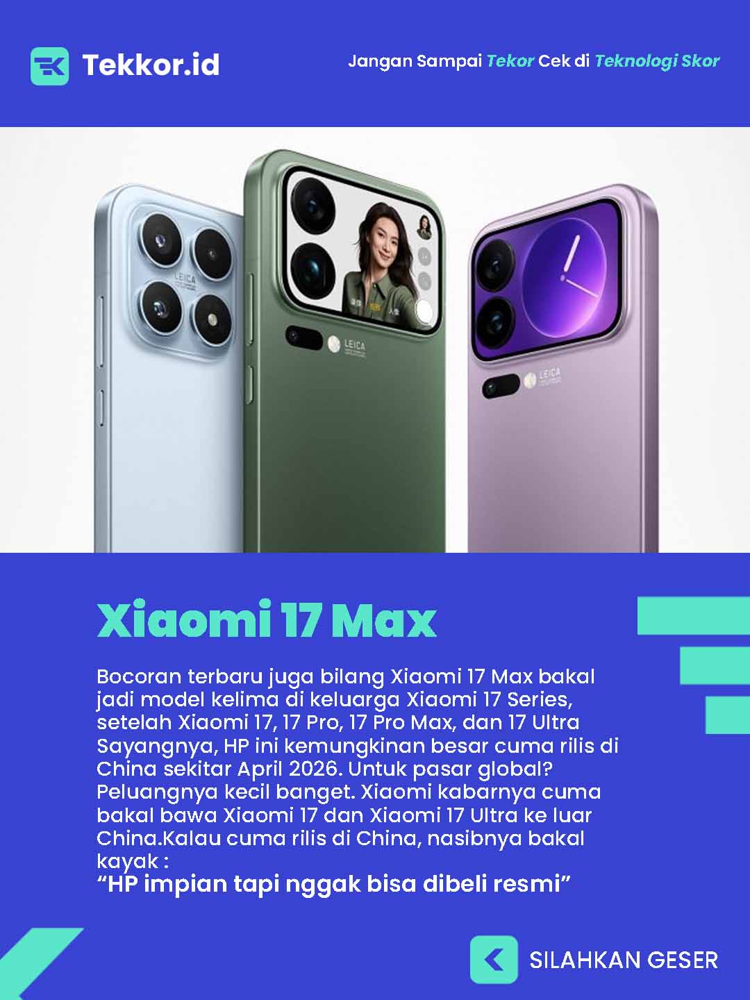 Sayangnya, HP ini kemungkinan besar cuma rilis di China sekitar April 2026. Untuk pasar global? Peluangnya kecil banget. Xiaomi kabarnya cuma bakal bawa Xiaomi 17 dan Xiaomi 17 Ultra ke luar China.